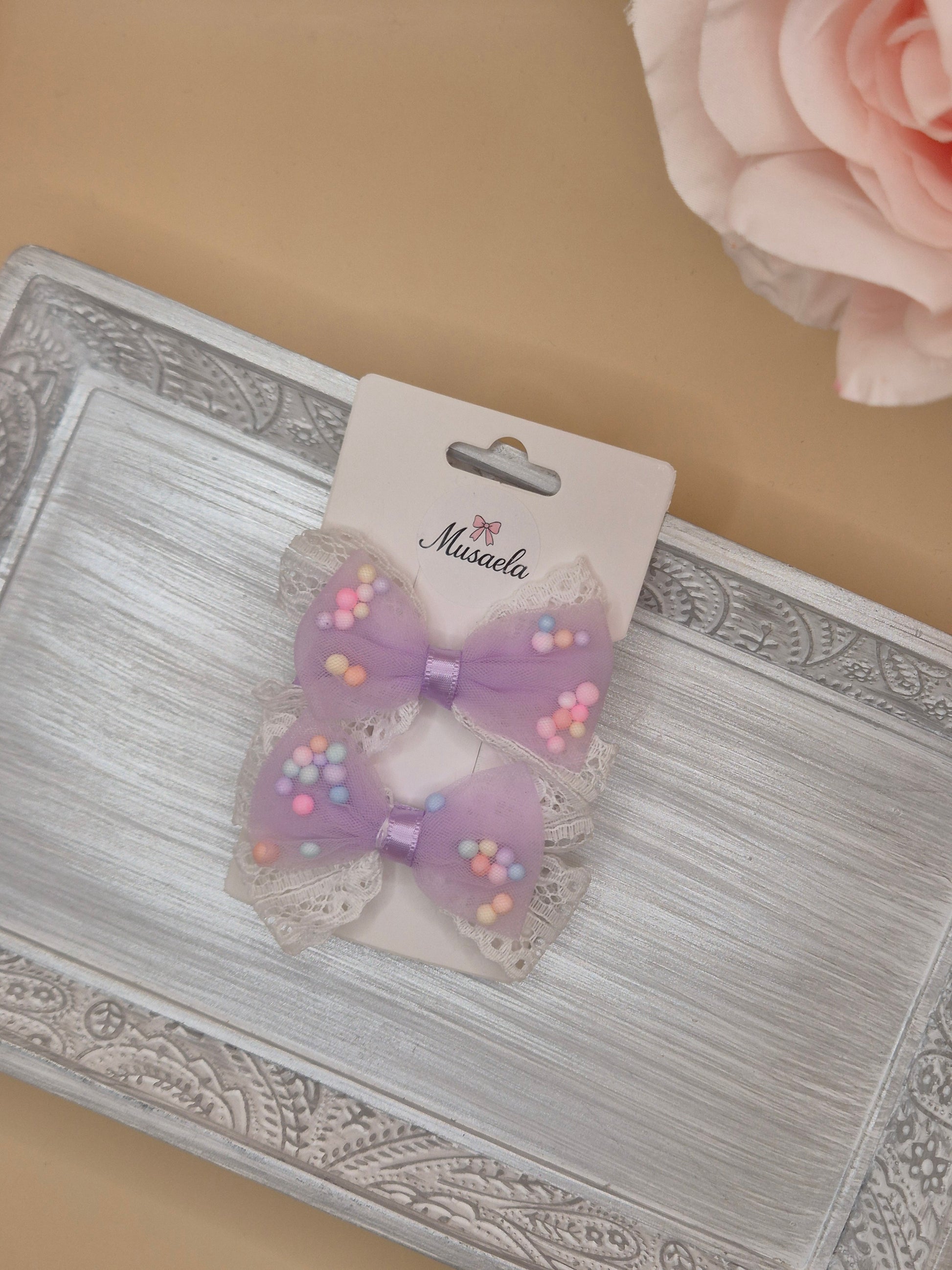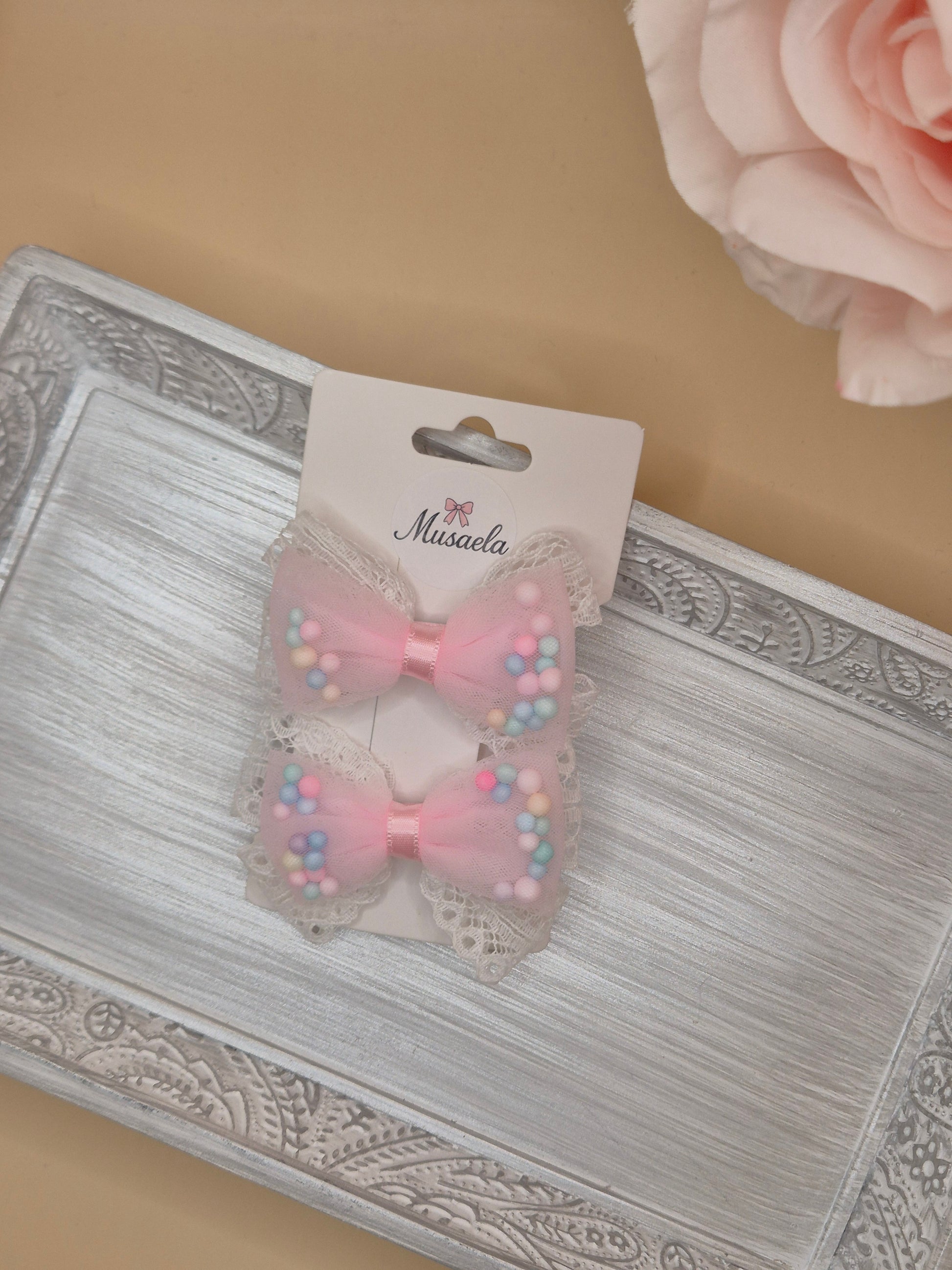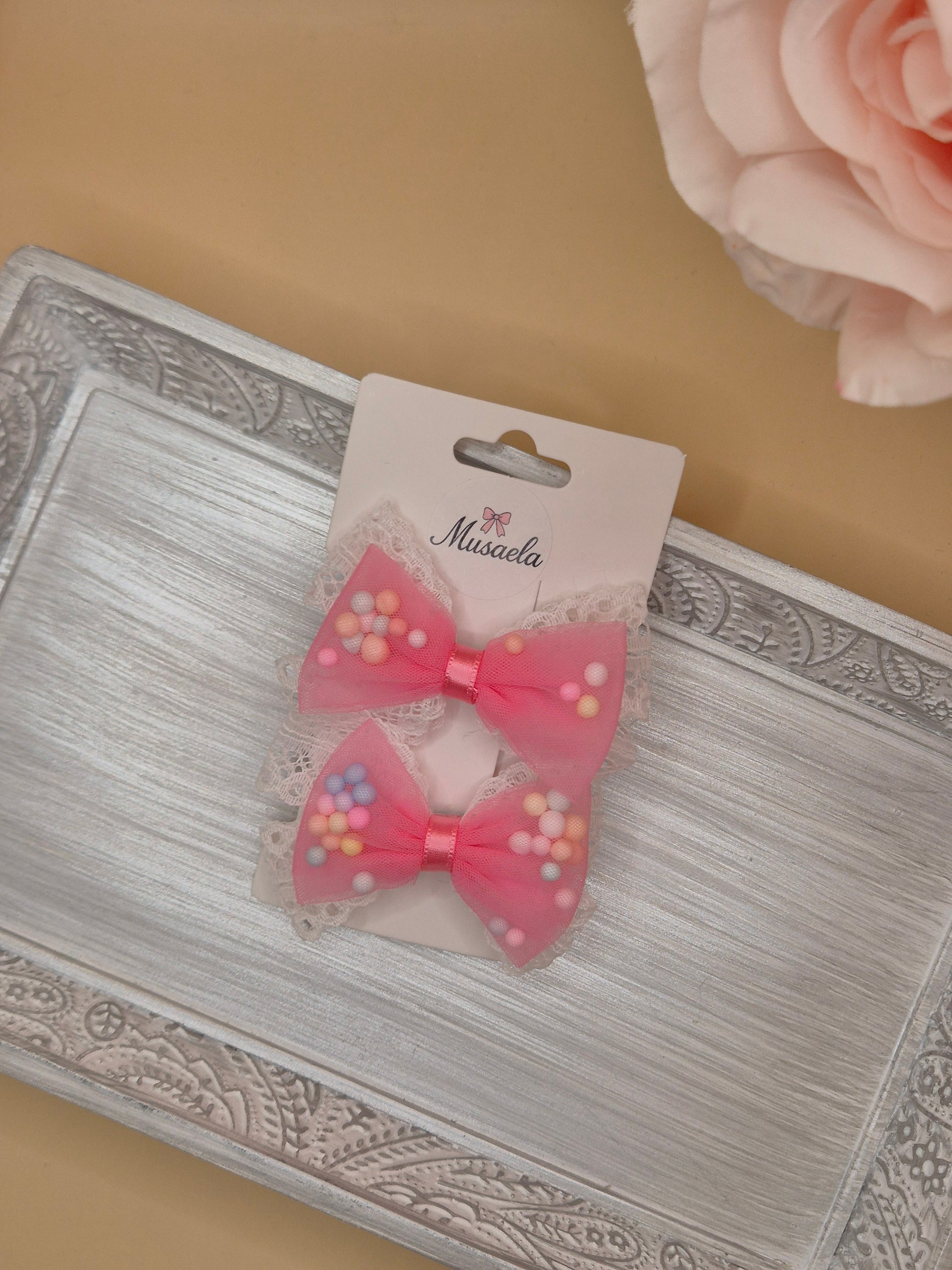 2er Set Haarspangen mit Schleife, Spitze und bunten Kügelchen