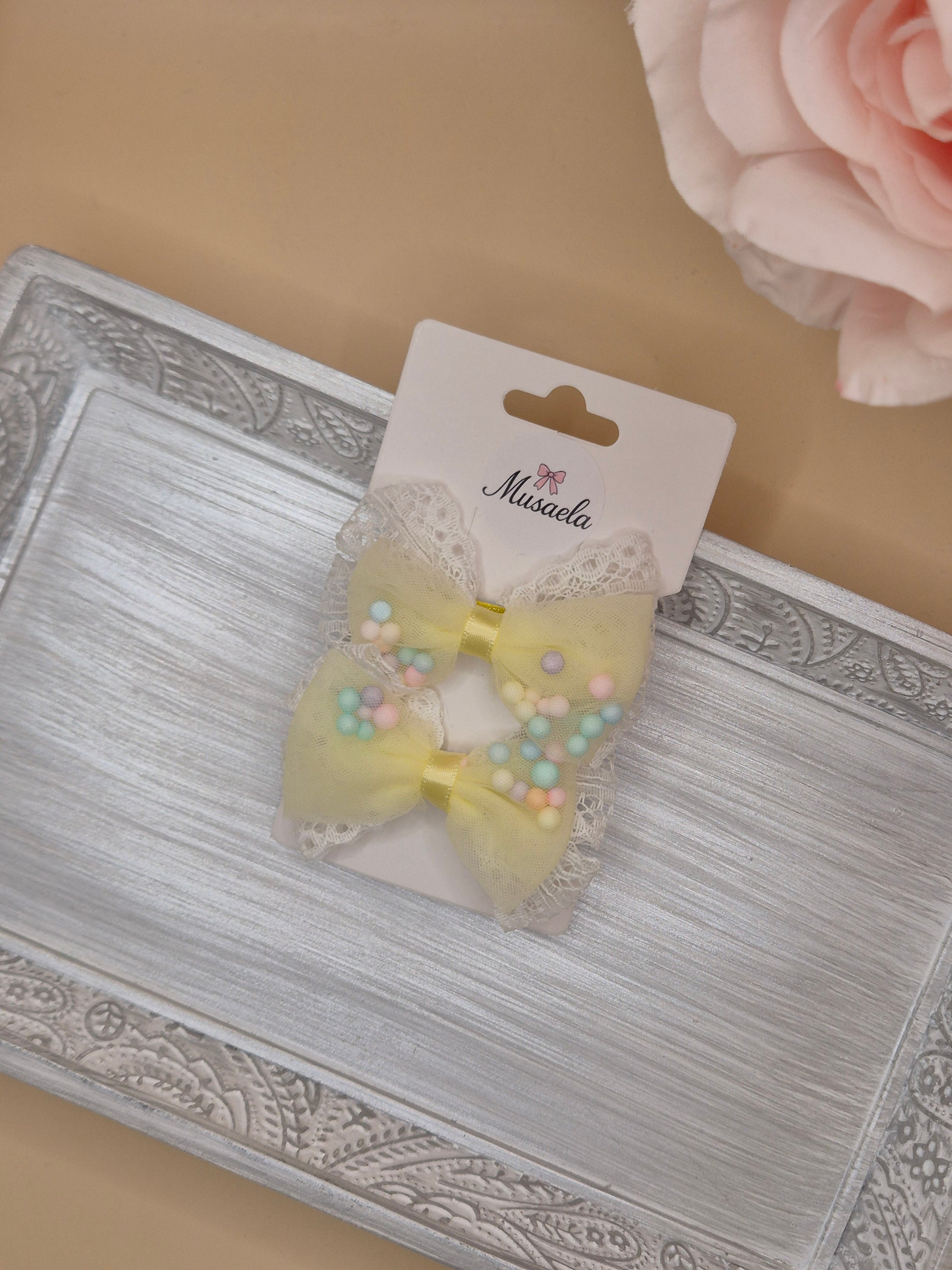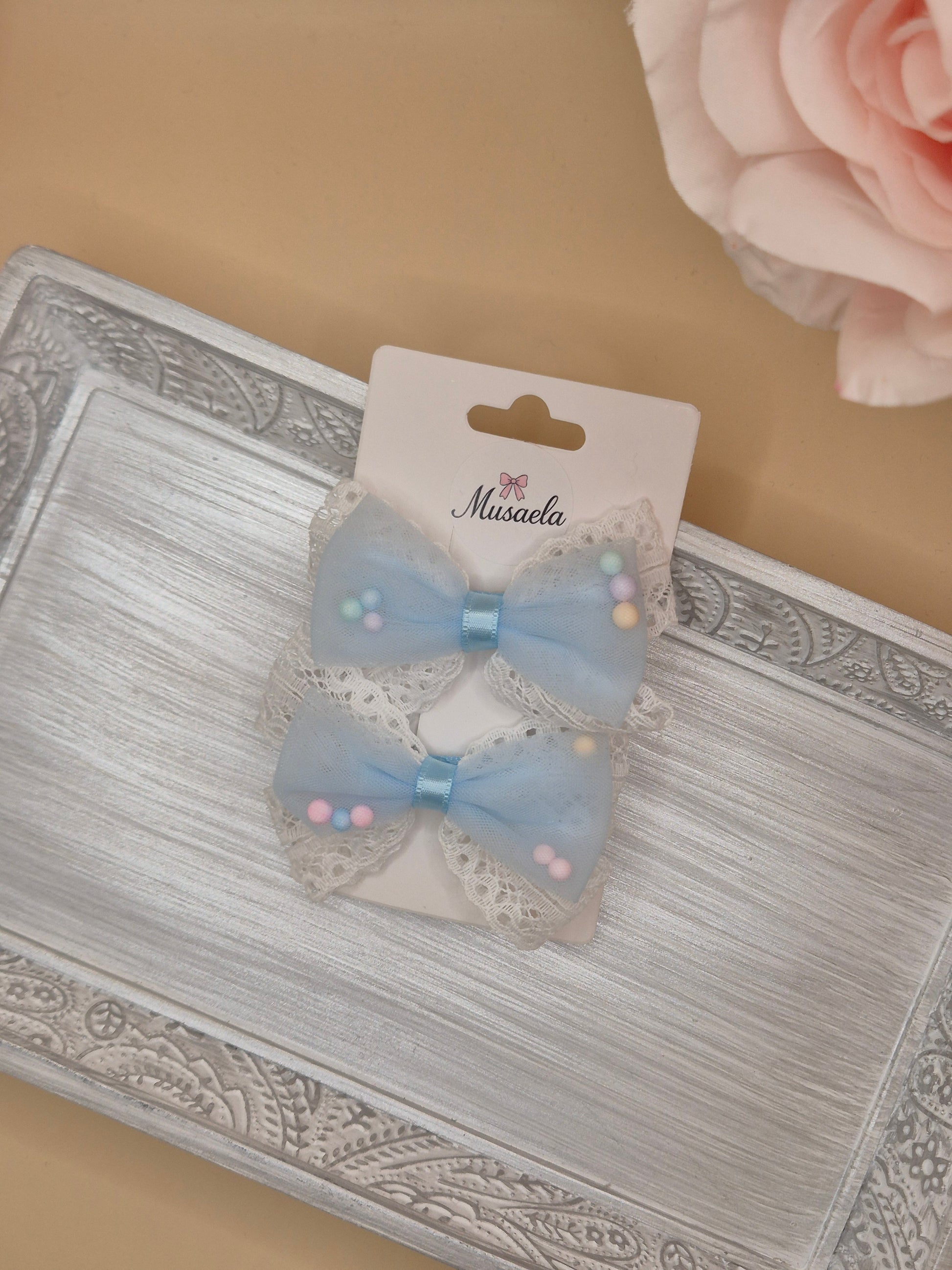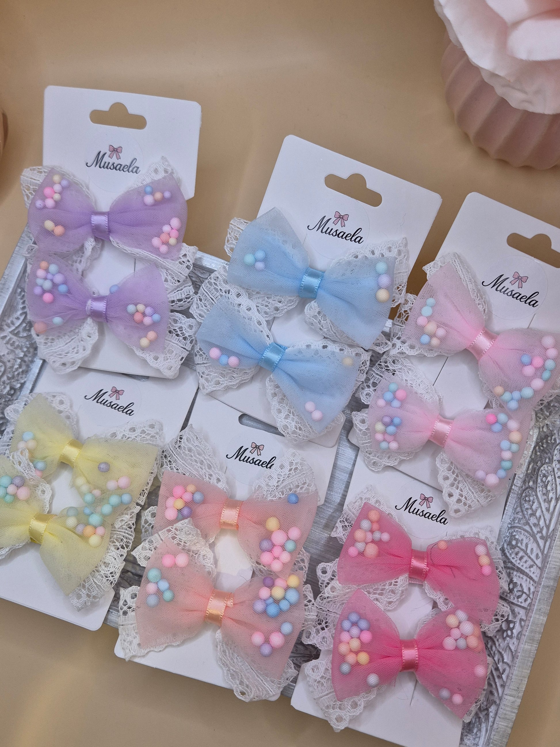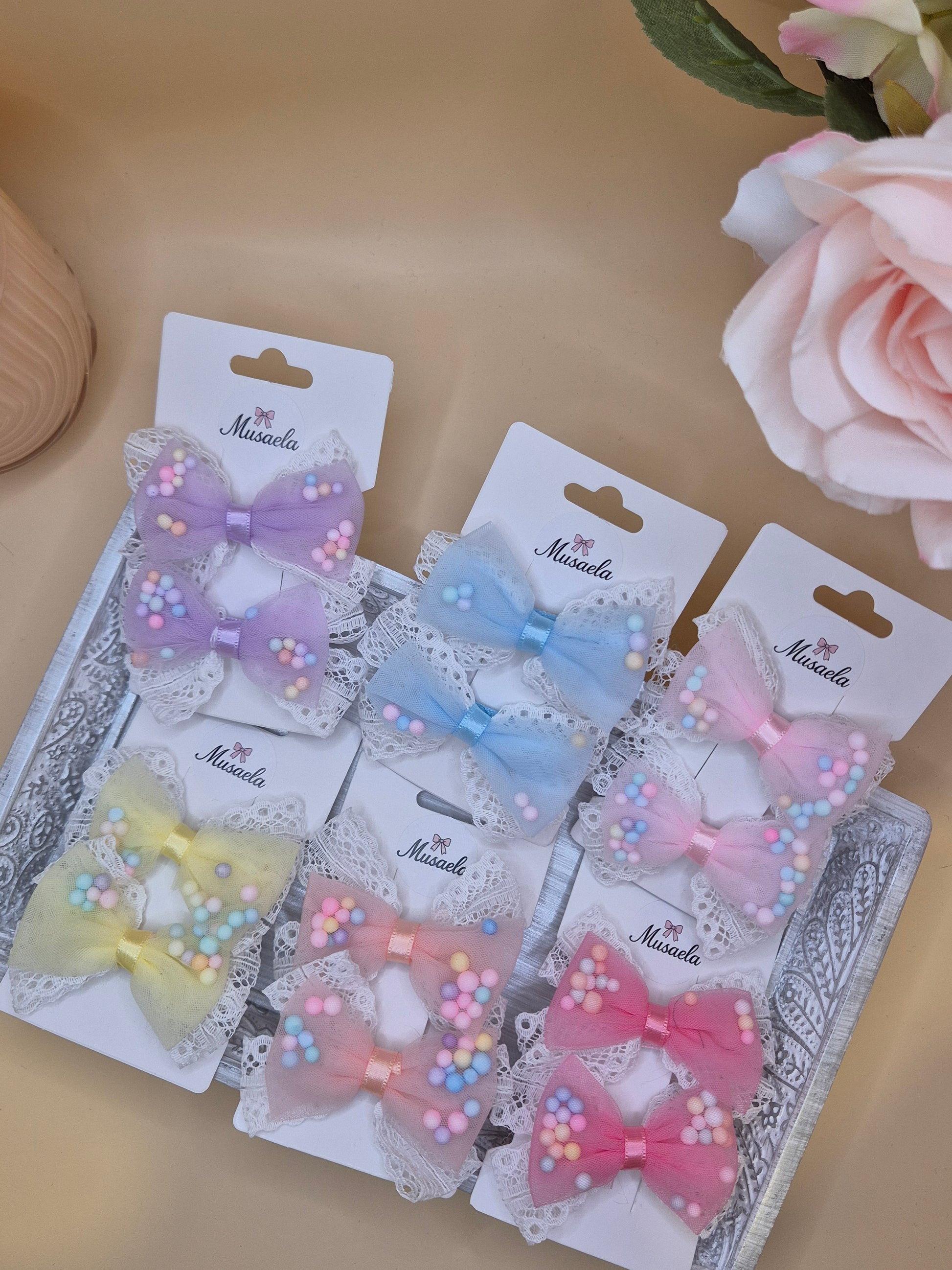 2er Set Haarspangen mit Schleife, Spitze und bunten Kügelchen